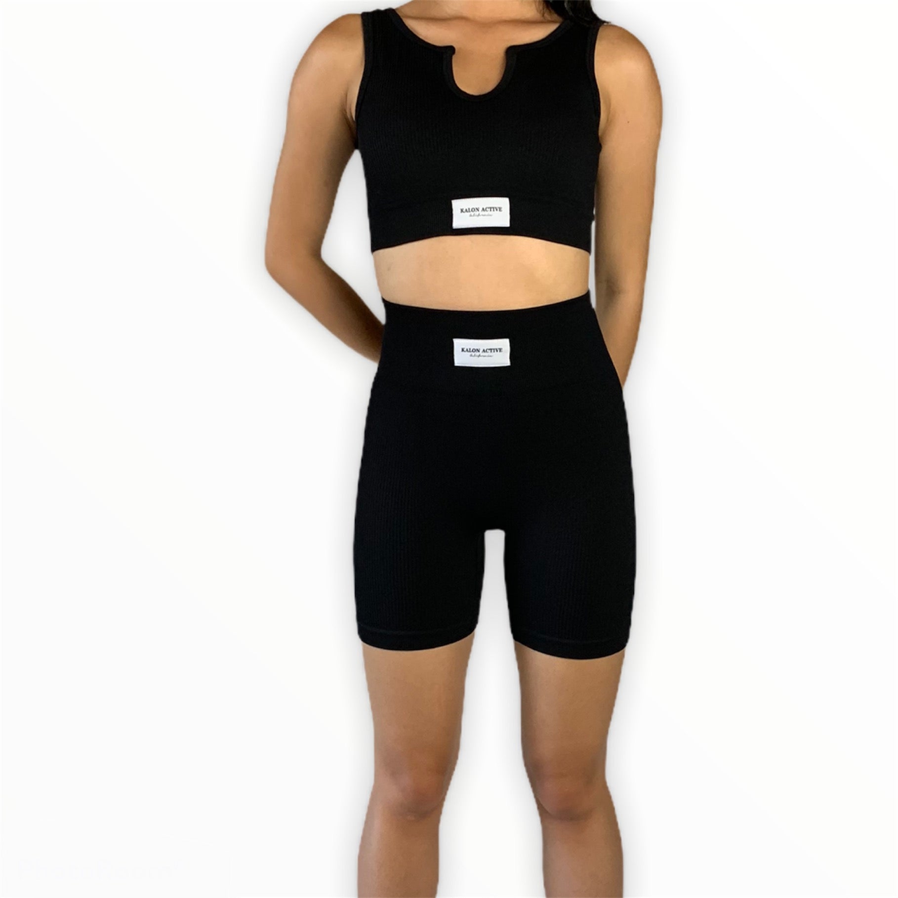Premium textured ribbed fabric elevates your look on and off the mat, seamless design with extra comfort support. The cute padded bra with crack proof logo gives your extra confidence on the go. Throw on our oversized shirt and our matching Ultimate Tiffany Ribbed Biker Shorts and you will be ready to reflex.